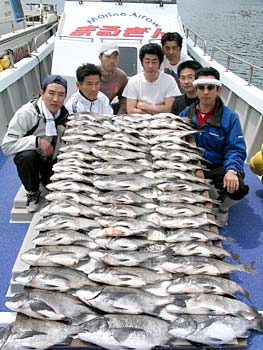 4月23日、荒巻さんグループは、阿値賀島一帯で、チヌを好釣果! 2.5kg を頭に良型サイズを約60枚ゲットです!
