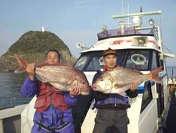小島玲子さんと久幸船長、五島でのクロ釣果。